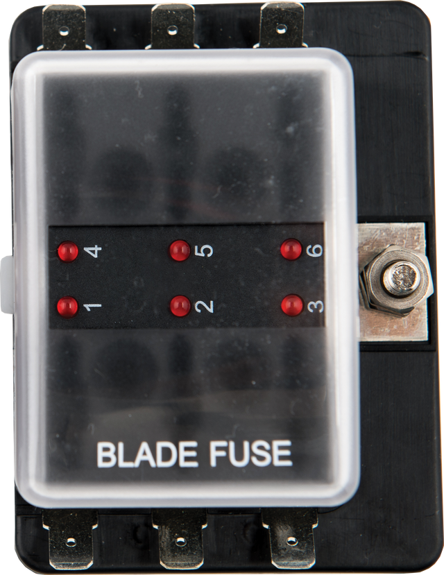 Marine Fuse Holder 6 Gang with LED Light Indicator Viper blade fuse holders come in 4, 6 and 10 gang versions and are designed for marine use. The inbuilt LED light glows when the fuse is broken, which allows you to quickly identify faulty fuses. Highly recommended for any battery management system in your vessel, complete with a clear removable clip on cover. The fuse holders can be joined in any combination by the solid link bar Terminal.
