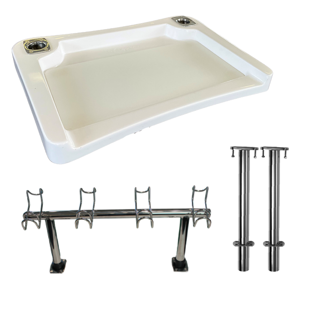 MADE IN AUSTRALIA! Removable Fiberglass Bait Board built for convenience and designed for performance. Introducing our new premium small removable fiberglass bait board featuring a sleek gloss gelcoat finish, designed for easy lift-out removal when not in use. Proudly manufactured in Australia, this board is built to withstand the elements while staying sharp and durable. Abrasion-resistant cutting surface to protect your knife edge, quick and easy installation drop-in, lift-out design includes: 2 x game-rated 15 degree stainless steel rod holders, 2 x 38mm stainless steel deck fittings, 2 x 38mm x 420mm stainless steel legs, mounting hardware inc. Includes P/N 10037 4 Way drop in Rod Rack