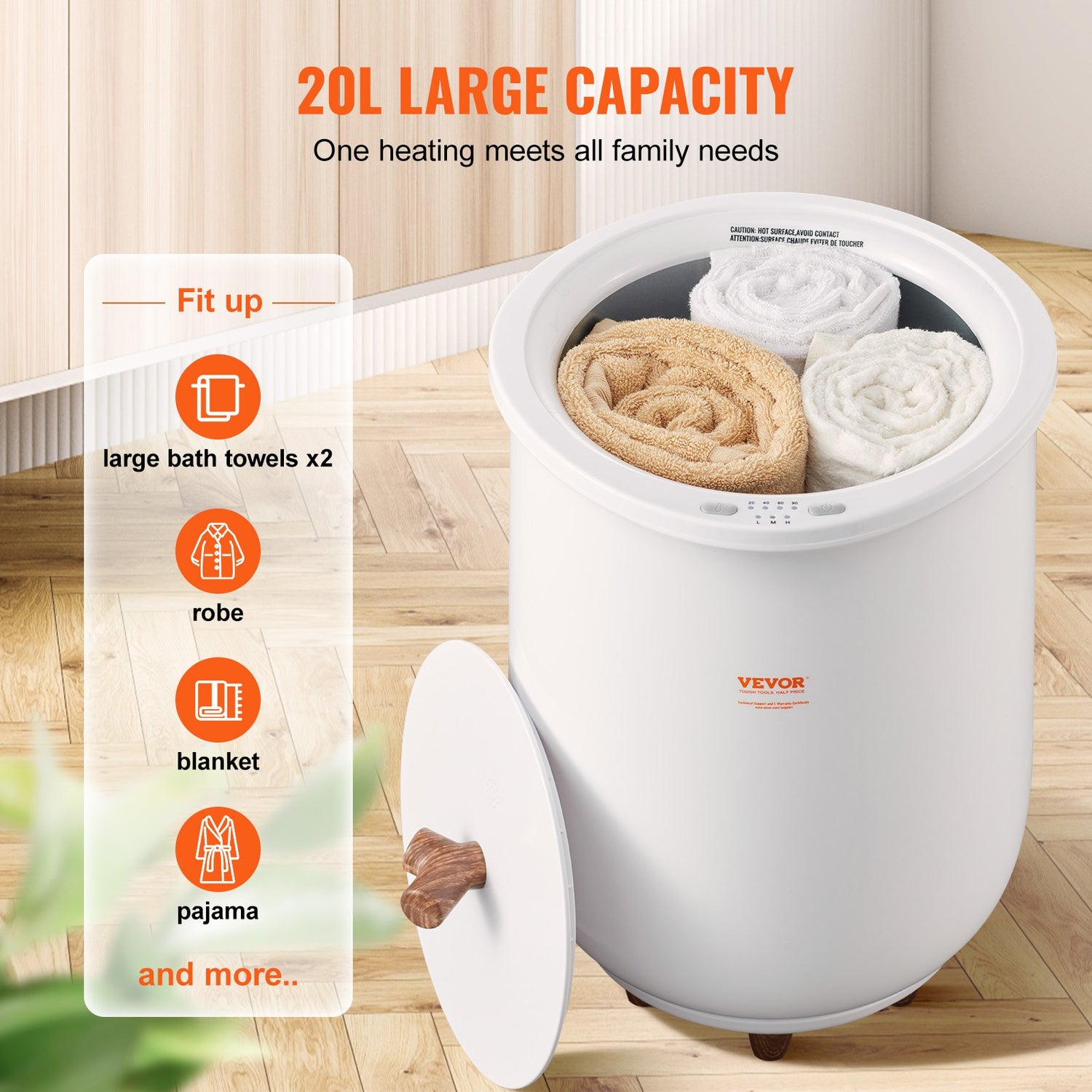 With a generous 20L capacity, VEVOR towel warmer for bathroom accommodates two oversized towels measuring 70 x 40 inches (approximately 177.8 x 101.6 cm). It's a must-have for larger households, ensuring everyone enjoys warm, cozy towels, robes, blankets, and more.