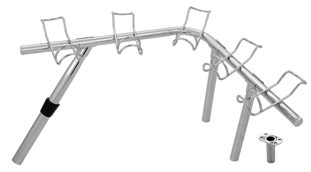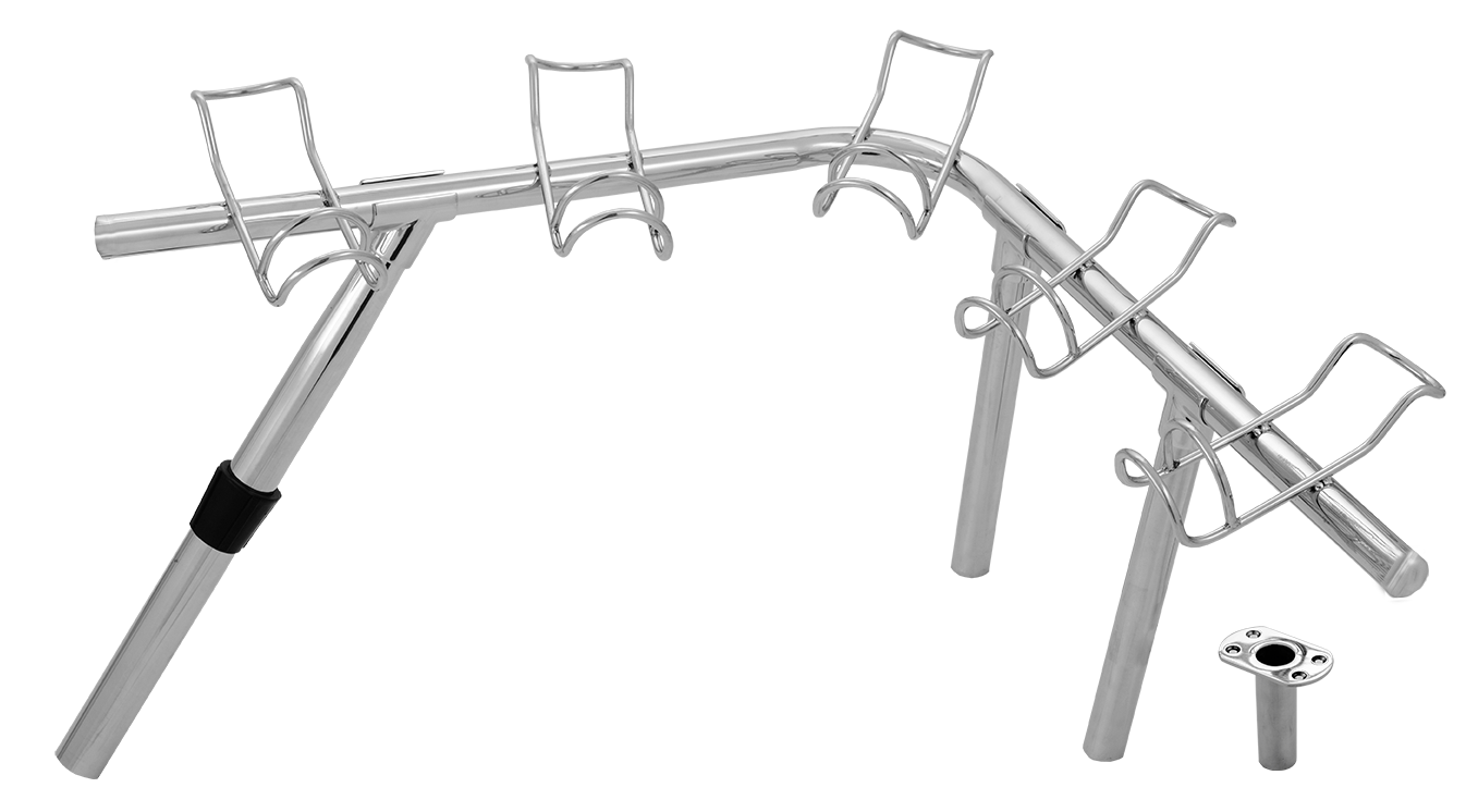 The easiest DIY corner rod rack to ever hit the market! Save yourself the expense of having a rack custom made for your boat. This version has a tapered leg each side and 2 straight legs. One leg fit into the supplied deck fitting 1 each side, the other long tapered leg fits into your existing 30 degree rod holder in your boat, then you simply cut the middle support leg to suit your desired height to rest against your boats gunwale area. Now you can fish 10 rods, keep an eye on all rods at once and have your family and friends in the boat without tripping over rods and tackle. Each rod holder is a double wire construction and made from hand polished 316 marine grade stainless steel. The corner racks are removable if required, simply lift them out in one piece. Package Contents: Both port and starboard sides (5 holders each side), 2 x female deck fittings, 4 x straight 25mm legs, 2 x tapered legs, 4 x T-Piece connectors and 2 x angled connectors. Also available in an all straight leg version, see part number 10030.