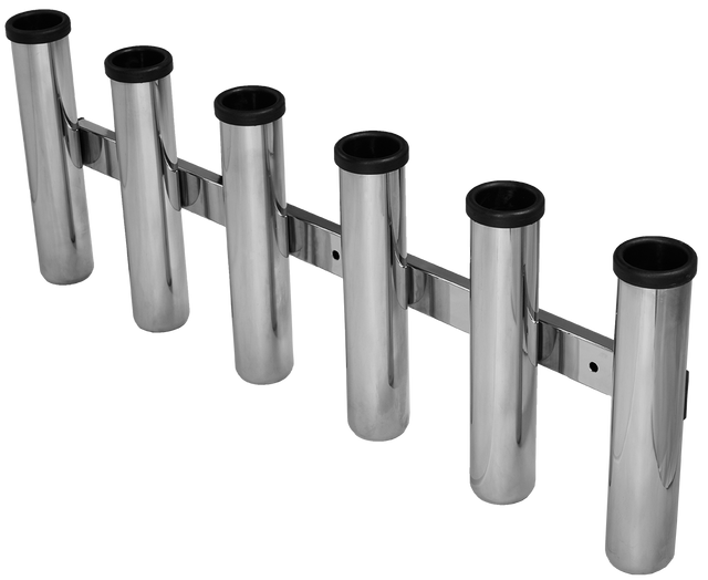 Viper Deluxe 6 Way Combing Rod Rack Sick of your lines tangling, rods getting damaged or even stood on and broken? these deluxe side mount combing rod holders simply bolt to the side of your boat, and no matter how rough it gets your rods and passengers are safe! The Viper deluxe version has rolled bottoms to each of the holders to eliminate sharp edges against your feet. The mounting bar is 15mm x 40mm square tube with fully welded gimble pins to stop your rods from spinning and damaging your gelcoat. The holders also come with heavy duty end caps to protect your rod butts! The rod holders and mounting square tube are 316 Stainless Steel and are hand polished to a mirror finish. Overall length: 720 mm Overall height: 250mm Distance between chimney's/rod holder: 85 mm